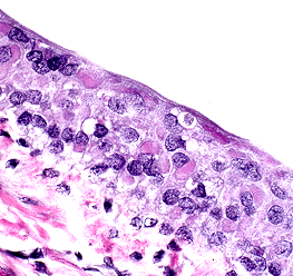 Renal tubular mineralization in the medulla is often seen in anorexic mink, probably due to dehydration. Cytoplasmic inclusions were also present in bronchiolar epithelium and in the urinary bladder mucosa. Severe bronchopneumonia was also present. The host range of canine distemper virus includes the dog, coyote, fox, wolf, dingo, jackal, raccoon, panda, weasel, mink, ferret, badger, skunk and otter. It was felt that raccoons may have transmitted the infection to mink in this case. A similar, if not identical virus, has been reported to cause distemper-like illness in captive and wild leopards, tigers, lions, jaguars and civets. Similar viruses infect harbor seals, porpoises and javelinas.