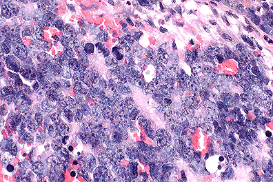 Gross Pathology: The globe was enlarged (0.5cm diameter) and protruded from the palpebral fissure. The eye was red-brown and solid. No extraocular structures appeared to be involved grossly. In one case (not the submitted case) a metastatic mass was detected in the subcutis of the neck.