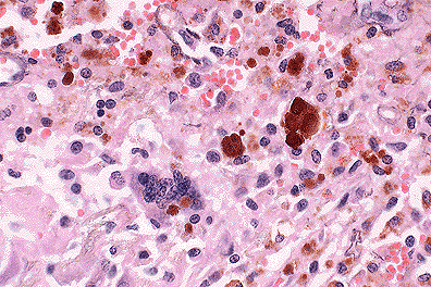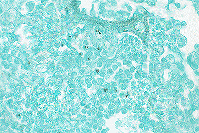 Pneumocystis carinii possesses two prominent antigens, major surface glycoprotein (MSG), and another 45-55kd molecule of unknown function. Either of these antigens is readily recognized by an immunocompetent host and stimulates both humoral and cell mediated immune responses. In the absence of an immune response however, P. carinii adheres to type I pneumocytes; this attachment may be facilitated by bridging between MSG and fibronectin. Once attached, P. carinii maintains an extracellular, intra-alveolar existence. P. carinii binds surfactant, which is thought to"hide" surface antigens and prevent recognition by the host's immune system. P. carinii pneumonia is suggested by the presence of large amounts of intra-alveolar surfactant, which appears as a foamy, eosinophilic material when stained with hematoxylin and eosin. The organisms stain with methenamine silver, periodic acid- Schiff, and Gram's stain.