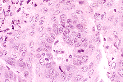 Conference Note: The lung mass is composed of polygonal cells arranged in trabeculae, nests, and papillary projections that replace the normal pulmonary architecture. The neoplastic cells have distinct cell borders and moderate amounts of eosinophilic, granular cytoplasm. The nuclei are irregularly round, vesiculate, and have 1-4 magenta nucleoli. The mitotic rate is 1 per high power field. There is extensive multifocal necrosis, neutrophilic inflammation, and keratin accumulations. Squamous cell carcinoma of the lung is believed to arise from bronchial, bronchiolar, or alveolar epithelium, or from benign keratinizing squamous cysts. Some of the conference attendees diagnosed this pulmonary tumor as bronchiolo-alveolar carcinoma. Bronchiolo-alveolar carcinomas grow on the preexisting pulmonary stroma in papillary, glandular and/or alveolar patterns and occasionally contain areas of squamous differentiation.