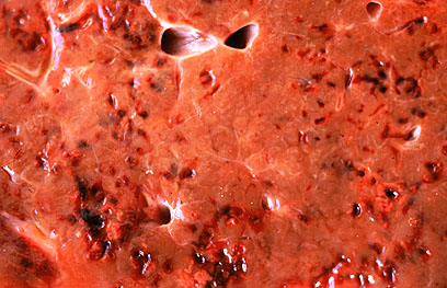 Gross Pathology: There was about 10 liters of serosanguinous fluid in the abdominal cavity and about 100ml in the pericardial sac. The capsule of the liver was covered by a thick multilayered fibrinous exudate. The liver was somewhat enlarged, with altered shape (more rounded) and firmer. The capsular surface was irregular and the cut surface had multiple linear hemorrhagic tracts on cross section.