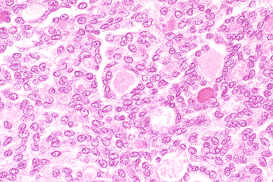 Adenocarcinoma of the apocrine glands of the anal sac is the most common malignant neoplasm of the perineum in aged female dogs; it is seen less frequently in male dogs. Metastasis is common, frequently to sublumbar lymph nodes, as occurred in this case. Often, the primary tumor is small and not detected clinically, but abdominal lymph nodes are greatly enlarged by metastatic adenocarcinoma. Thus, it is important for the pathologist to recognize this neoplasm when present in biopsy samples of abdominal lymph nodes and other tissues even when there is no history of a mass in the anal sac area. Widespread metastasis may also occur. The majority of dogs with adenocarcinoma of the apocrine glands of the anal sac develop humoral hypercalcemia of malignancy (HHM). Criteria for the diagnosis of HHM includes persistent hypercalcemia and hypophosphatemia, absence of tumor metastasis in bone, atrophy of the parathyroid glands and thyroid C-cell hyperplasia. There is remission of hypercalcemia when the tumor is excised and recurrence with regrowth. The pathogenesis of HHM is not fully understood; however, adenocarcinomas of the glands of the anal sac are associated with elevations in serum levels of parathyroid hormone related protein (PTHrP). When anti-PTHrP antibody is given, serum calcium levels decrease, implying that PTHrP plays a significant role in producing HHM.