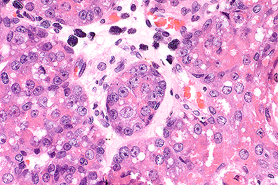 Microscopically, the preputial gland adenoma is a well-circumscribed, expansile multilobulated mass composed of neoplastic polygonal cells arranged in acini, clusters, cords and lobules separated by a fine fibrovascular stroma. The neoplastic cells have distinct cell borders with a moderate amount of eosinophilic granular cytoplasm. Neoplastic cells located in the center of the lobules contain many intensely eosinophilic intracytoplasmic granules. The nuclei are irregularly round with finely stippled chromatin and a distinct nucleolus. The mitotic rate is less than one per ten high power fields. Central necrosis of neoplastic cells may be present in lobules.