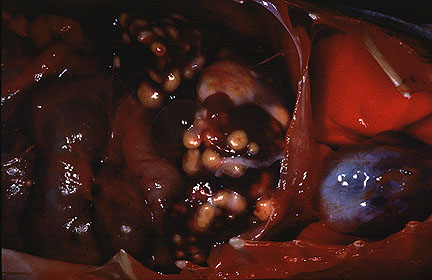 Gross Pathology: White, firm to gritty, nodular masses 2-20 mm in diameter were found in the lung, liver, spleen, tracheobronchial lymph nodes, and sublumbar lymph nodes. These masses contained white, solid, caseous centers. There were adhesions of loops of intestine to the root of the mesentery.
