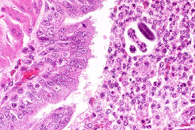 Lung: Numerous neutrophils fill alveoli and bronchi. There is abundant necrosis and numerous intraepithelial eosinophilic cytoplasmic inclusions. There are multiple larval and adult nematode cross sections within a bronchus, along with associated neutrophils, eosinophils, macrophages and occasional multinucleated cells.