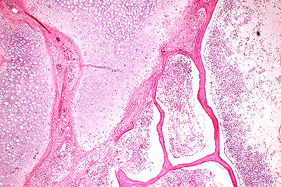 Sections of undecalcified diaphyseal femur are submitted for conference participants. The diaphysis of each femurs is markedly thickened. There is a diffuse lack of cortical bone with a proliferating cuff of hyperplastic cartilage that has largely replaced and compressed the diaphyseal cortical bone. Numerous scattered osteoclasts and a row of osteoblasts line most of the remaining spicules of cortical bone. Periosteal reaction is minimal. Bone marrow elements are present in low, but adequate numbers. Sections of mandible (not submitted) have a diffuse lack of cortical bone with marked diffuse osteoclastic activity and replacement of bone with a loose areolar fibrous connective tissue compatible with fibrous osteodystropy (osteodystrophia fibrosa) . In addition, sections of thyroid gland exhibited mild to moderate diffuse hypertrophy and hyperplasia of follicles containing abundant colloid. Parathyroid tissue was not observed on gross or histologic examination.