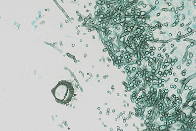Aspergillus spp. are ubiquitous saprophytic molds. Hyphae of Aspergillus spp. are 3 to 6 æm in width, are septate, have parallel walls, and demonstrate dichotomous branching. The conidial heads are distinctive and are composed of a terminal vesicle with one or two layers of phialides which produce chains of conidia, (also called conidiospores), from their tips. The vesicle merges at its base with a conidiophore (the section of hyphae that supports the conidial head).