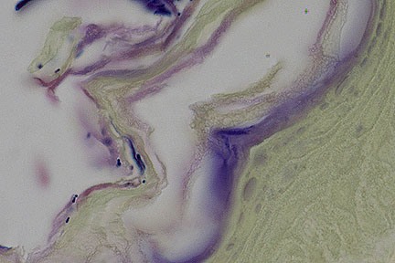 There are additional histological lesions in the skin sections apart from those described above related to phototoxicity. Hair follicles are dilated and occasionally filled with laminated keratin and there is a moderate granulomatous inflammation in the dermis associated with ruptured hair follicles. These changes are characteristic for hairless mouse strains, although in skin with phototoxic lesions they are usually more numerous than in untreated mice. Hairless mice are homozygous for the autosomal recessive gene 'hairless' and loose hair after growth of the first pelage. After a few weeks of age the animals are essentially naked except for scattered hairs from tylotrich follicles.