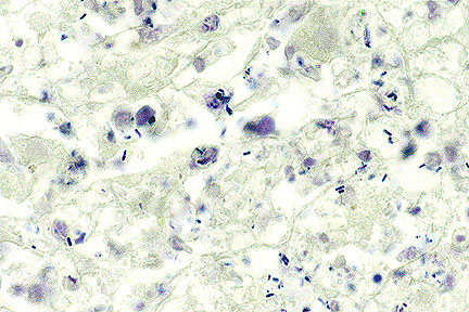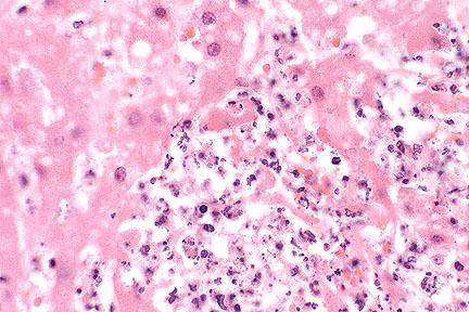 Multiple foci of hepatocellular necrosis and intense suppurative inflammation were randomly distributed throughout the liver. Gram stains revealed short gram-positive rod within the lesions. Warthin-Starry stains were negative, ruling out the presence of Bacillus piliformis.