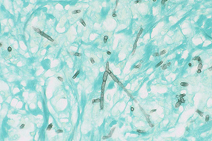 Conference Note: Aspergillus sp. are common soil saprophytes and have a worldwide distribution. Aspergillus can be differentiated from other fungi in tissue sections by the presence of thin, parallel walls, dichotomous branching, septate hyphae, and characteristic conidiophores. These structures are best demonstrated with staining by the periodic acid Schiff procedure or silver stains.
