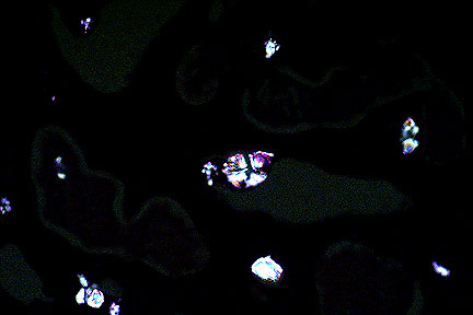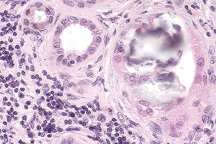 Histologically there was massive tubular ectasia, calcium oxalate crystals in tubular epithelium and lumen, focal atrophy of convoluted tubules with thickening of the basement membrane, sclerosis and atrophy of some glomeruli and diffuse interstitial fibrosis with mononuclear cell infiltration. Some crystals were also visible in the interstitium and were surrounded by a granulomatous reaction with giant cells. A moderate arteriosclerosis with thickening of the intima was evident in the renal arcuate arteries. Arcuatae and interlobulares and the intramural coronary arteries.