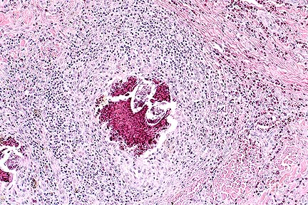 Histologically, lesions consist of a highly vascular granulation tissue with neutrophils and other inflammatory cells at the periphery and central aggregates of eosinophils. If larvae or larval remnants are present, they are surrounded by epithelioid macrophages, multinucleate giant cells, eosinophils, lymphocytes, and plasma cells (eosinophilic granulomas).