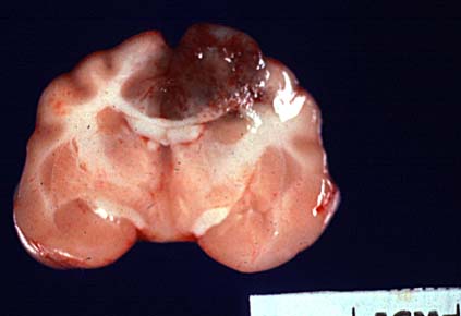 Brain: meningoencephalitis, suppurative and hemorrhagic, subacute, focal, severe.