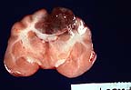 Gross Pathology: Gross lesions were restricted to the central nervous system. The dorsomedial aspect of the left cerebral hemisphere contained a firm, well-vascularized brown and white mottled nodular mass measuring 1.5 cm in greatest diameter. This lesion involved the corpus callosum but did not extend into the right cerebral hemisphere.
