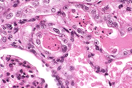 Conference Note: Redroot pigweed (Amaranthus retroflexus) has been reported as a cause of perirenal edema and acute renal failure in swine, cattle, and, less frequently, horses. Grossly, Amaranthus intoxication produces perirenal edema and occasionally edema of the intestine, mesentery, and ventral abdominal wall. Ascites and hydrothorax may also develop. The kidneys are pale, but usually not enlarged. Histologically, there is degeneration and necrosis of tubular epithelium. Glomerular hypercellularity and necrosis may also be present; in this case, some of those attending the conference noted multifocal necrosis of cells within glomerular tufts. Another finding in this case is the presence of hyaline droplets, eosinophilic homogeneous globules of protein, within the cytoplasm of tubular epithelial cells. Hyaline droplets are lysosomes distended by protein that is being degraded for return to the circulation as amino acids. The presence of hyaline droplets indicates that the process of protein resorption by proximal tubules is saturated.