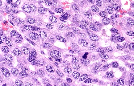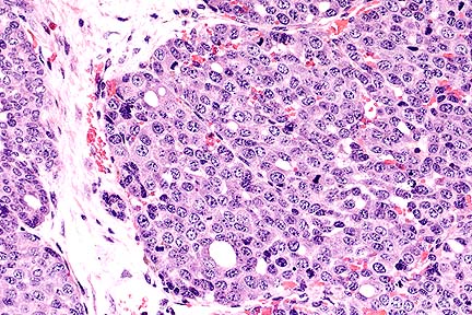 Essential microscopic features are those of a circumscribed, non-encapsulated, multi-lobulated, nodular mass effacing the gland. Lobules are composed of a uniform population of cells forming densely cellular sheets and thick cords which surround multiple, variably-sized spaces that are either empty or contain variable amounts of blood and/or fibrin, proteinaceous secretory material and degenerate cells. In some areas, the cells form poorly-defined tubular structures. Cells are polygonal with indistinct margins, abundant eosinophilic cytoplasm and oval to round nuclei with clumped chromatin and occasionally 1-2 prominent nucleoli. Mitotic figures number 6 to 12 per HPF. Focal areas of necrosis occur within lobules.