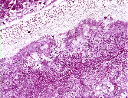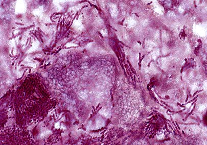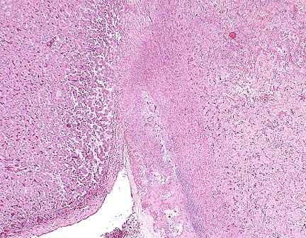 Histopathology: The liver had multifocal to coalescing non-encapsulated areas of eosinophilic and amorphous material admixed with cellular debris (caseous necrosis) with minimal inflammatory reaction. There were numerous colonies of gram-negative filamentous bacteria and occasional cocci in the periphery of the necrotic areas. The adjacent sinusoids contained lymphocytes and neutrophils and sinusoidal cells were prominent. Occasionally (not in all slides), there were necrotic foci adjacent to veins (mainly central veins) and there was focal disruption of the vein wall with invasion of filamentous organisms into the vessel lumen and fibrin thrombi. Electron microscopy of the liver lesions demonstrated numerous, 1-2.5 m in length, rods with morphology characteristic of gram-negative bacteria and straight or blunt borders. The organisms were located both within hepatocytes and free in the interstitium.