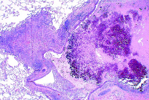 Contributor's Diagnosis and Comments: Lung, focal granulomatous pneumonia with caseous necrosis and multinucleated giant cells. Mycobacterium tuberculosis.