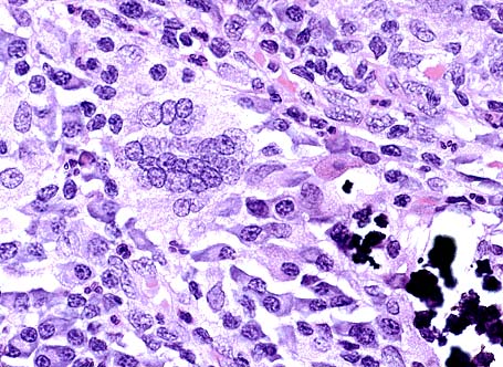Conference Note: The inclusions in submitted tissues are eosinophilic to amphophilic, range up to 10 microns in diameter, and did not appear to be associated with degenerative or inflammatory changes. The morphologic features of the fungus are consistent with the those of the Class Zygomycetes and not with Aspergillus or Trichosporon spp. These features include broad, thin-walled, infrequently septate, pleomorphic hyphae that range from about 5 to 20 m in width and irrgeular right angle branches. The fact that the hyphae stain well with H&E is also characteristic of a zygomycete.