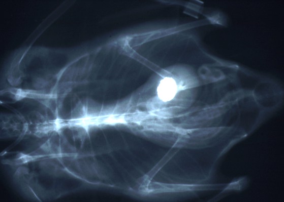 eider duck with a metal foreign object in the ventriculus. (31K)