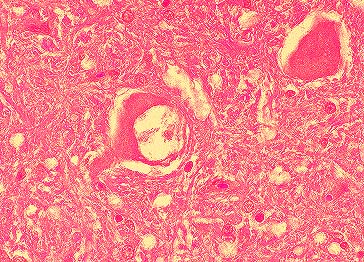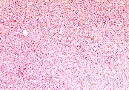 in the brain stem of a Suffolk ewe with scrapie. (HE, 100X, 61K)