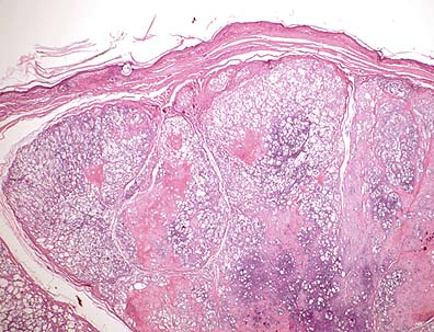 Gross Pathology:. The skin specimen was comprised of a gray gelatinous, semitranslucent, lobulated, subcutaneous mass covered with skin.