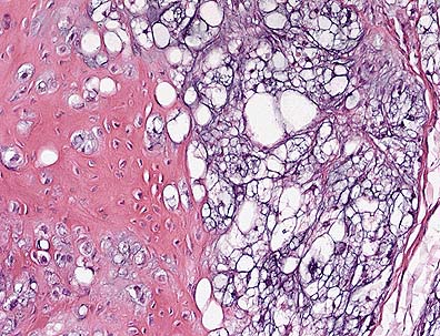 The tumor is composed of multiple lobules comprised of vacuolated cells with light pink or light blue cytoplasm. Scattered among the vacuolated cells are irregular islands of cartilage and bone. The differential diagnosis includes mucinous chondrosteoma and chordoma. Chordomas are rare in animals with the exception of mink and European ferrets. These tumors are presumed to arise from notochordal remnants.