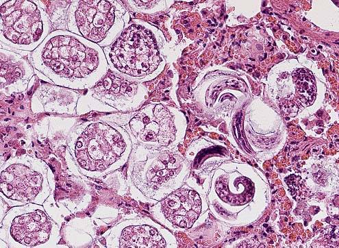 The pulmonary lesions are quite characteristic, usually being in the form of 1-10 mm diameter nodules, which represents nests of eggs and larvae. These nodules are yellowish and firm, scattered throughout the parenchyma but more common in the peripheral lung. A small amount of creamy exudate can be expressed from each nodule. Severe, confluent consolidation can produce clinical signs of chronic coughing and weight loss. Histologic lesions include dense collections of mononuclear cells, and occasional giant cells especially around degenerate larvae. There is often bronchiolar smooth muscle hyperplasia, catarrhal and eosinophilic bronchiolitis, hyperplasia of submucosal glands and smooth muscle hypertrophy and hyperplasia within pulmonary arterial walls. The granulomatous alveolitis and catarrhal bronchiolitis gradually regresses. However, the hypertrophy and hyperplasia of the smooth muscle in arteries, bronchioles and alveolar ducts persists.