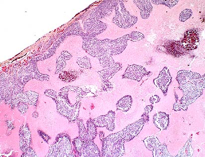 Conference Note: This case has classic features of glioblastoma multiforme, which is often simply called high grade astrocytoma. These features include high cellularity, pleomorphism, necrosis, subpial spread, cortical infiltration, necrosis surrounded by "pseudopalisades" and areas of glomerulus-like endothelial proliferation. Recent evidence suggests that vascular endothelial cell growth factor (VEGF) is secreted by malignant astrocytes perhaps in response to hypoxia.