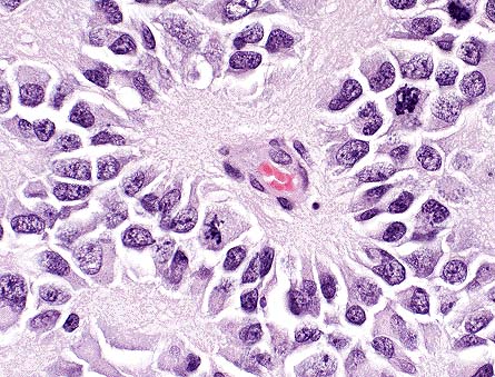 Astrocytomas generally occur as soft tissue masses in the substance of the cerebral hemispheres, and produce a spectrum of clinical signs based on their exact location. The majority of astrocytomas are well-differentiated with a relatively uniform population of transformed astrocytes having oval nuclei, little heterochromatin and poorly defined cell borders. The tumors can be graded, but regardless of grade there is a background of astrocytic processes between neoplastic nuclei. Higher grade astrocytomas are characterized by increasing nuclear anaplasia, mitotic activity and vascular proliferation. In the adjacent parenchyma, endothelial cells may form glomeruloid proliferations within vascular lumina. These are prominent in high grade astrocytomas, and were present in this case. The highest grade astrocytomas are usually very cellular, and have a mixture of firm white areas, and softer yellow foci of necrosis. These latter features, especially the presence of necrosis, have given rise to the term glioblastoma multiforme. Immunohistochemistry performed by AFIP was positive for glial fibrillary acidic protein (GFAP) and negative for S100, synaptophysin, cytokeratin, and vimentin.