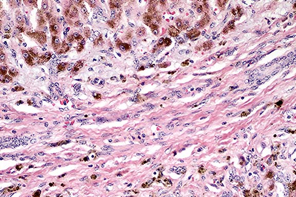 Conference Note: The brown granular pigment stained blue with Perls iron stain, confirming that it is hemosiderin.