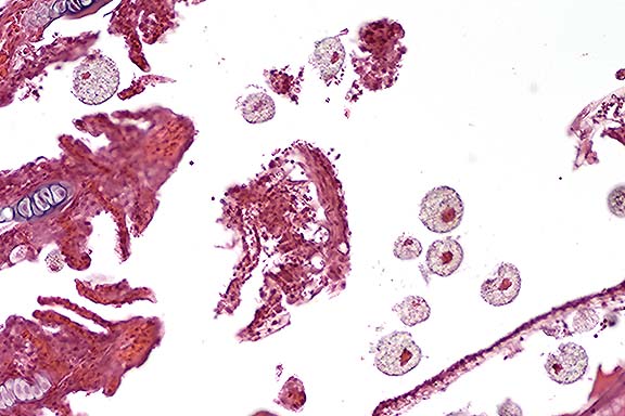 Conference Note: At least three morphologic characteristics allow one to differentiate Piscinoodinium, a dinoflagellate, from Ichthyophthirius, a ciliate, in histologic section. Ichthyopthirius (Ich) trophonts are often encysted within the host epithelium of gills or skin; Noga3 considers this to be a pathognomonic finding. Ich has a horseshoe-shaped macronucleus and the trophonts are generally larger than those of Piscinoodinium, ranging up to 1 mm.3,5