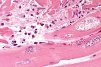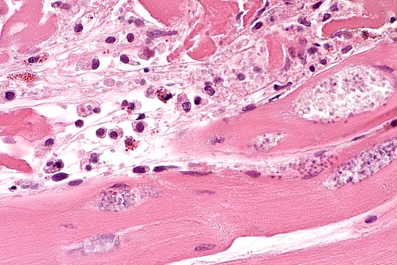 Contributor's Diagnosis and Comments: Skeletal muscle; myositis, acute to chronic, multifocal, moderate, with protozoa. Etiology: microsporidia