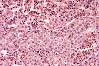 Conference participants observed multinucleated giant cells within the pancreas, but were unable to definitively characterize them based on histomorphology alone. Although these may represent virus-induced syncytial cells, the possibility that they are histiocytic giant cells cannot be excluded.