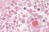 Differentiation between Acanthamoeba species and related organisms is difficult in histologic specimens. Although PAS and Calcoflour white are useful in locating cysts, staining of trophs by Giemsa and mucicarmine can help differentiate them from macrophages. Immunoflourescent staining is helpful in speciation, but has not yet been done on this case. Acanthamoeba can also occasionally be observed in CSF by their motility, although it has been remarked that they are relatively less vigorous in their movements than Naegleria.