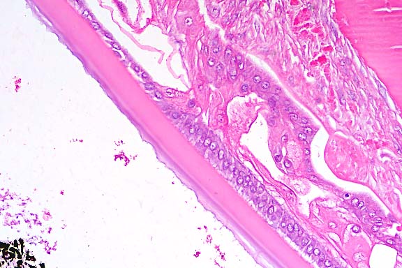 Because of its simple structure, physiology, and lack of vascularity, the morphologic changes that the lens can exhibit are primarily limited to: abnormal growth changes in the epithelium (epithelial hyperplasia and metaplasia); deterioration of the lens protein with coagulation and disorganization of the lens fibers (hydropic change; deposition of calcium salts or cholesterol); and rupture of the capsule which exposes the lens substance to external forces that may lead to liquefaction, organization, or dissolution. The precise mode of action of substances harmful to the lens is not always clear, but changes in the aqueous, which bathes and provides nutrition to the lens, probably precede any effects.