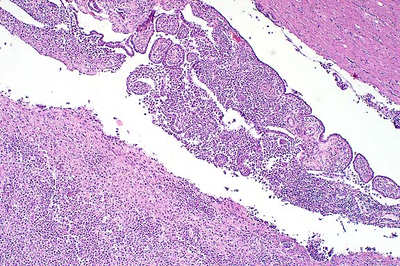 History: A one-month duration of weight loss was reported. Three days prior to euthanasia, the dog developed episodic blindness, pacing, head pressing, seizures, lethargy, and high fever (106 F).