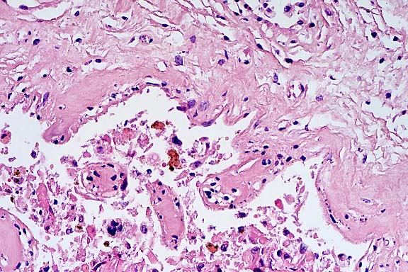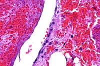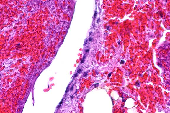 blood vessels. The 40x view shows the thrombus and vessel wall