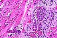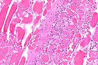 - 1. Moderate necrosuppurative myositis with fibrinoid necrosis