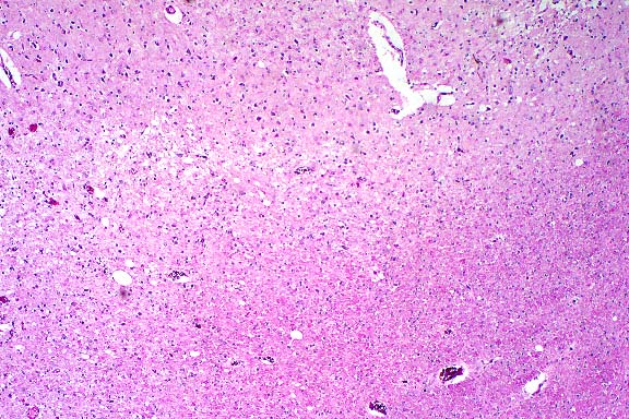 of necrosis, with vacuolation of the neuropil, and gliosis; endothelial