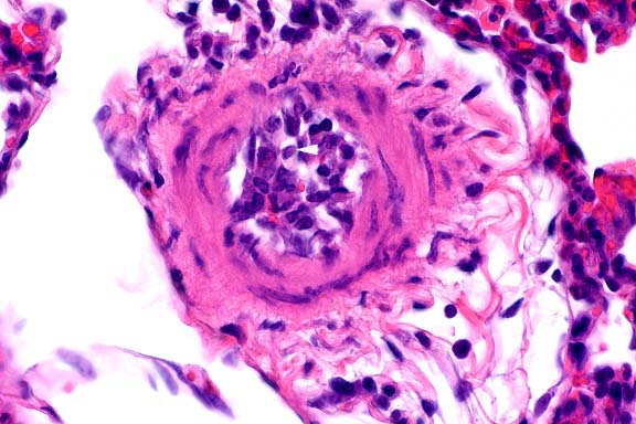 is surrounded by congested, consolidated lung parenchyma.