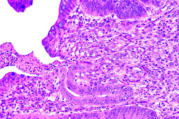 some areas, neoplastic cells palisade along the vascular stroma.