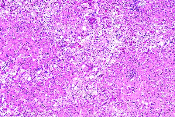 polygonal cells arranged in broad cords, nests, packets and solidly