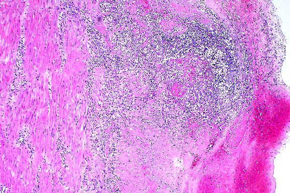 of neutrophils, lymphocytes, and macrophages. In some vessels,