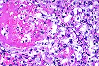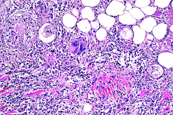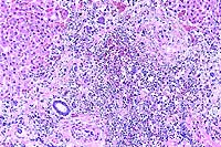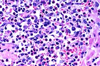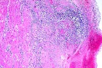 by inflammatory cells. There is multifocal perivascular hemorrhage.