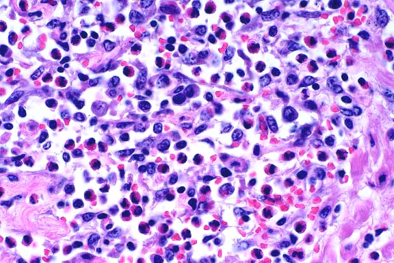 replaced by high numbers of eosinophils, lymphocytes, macrophages,
