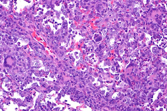over the pleural surface of all pulmonary lobes. Histologically,
