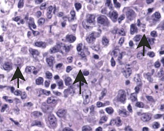 Many thanks to this contributor for an interesting case and well-written comment! It has been a while since the WSC saw a case of atoxoplasmosis (WSC 2009, Conf 18, Case 3), and this case provided some excellent discussion points. This was a challenging slide for many participants due to the lymphoproliferative nature of this protozoal infection, which, depending on the severity of the infection and the species affected, can be confused with lymphoma caused by gallid herpesvirus-2 (Marek?s disease), and avian retrovirus (lymphoid leukosis), etc.3 This was true in this conference, and some participants wondered about a lymphoma as the primary disease with the protozoa being secondary. The Isosporaserini were easier for the participants to find in this collection of tissue, but finding the flagellates, (Cochlosoma anatis) proved more difficult on the Hand E section (however, once the first flagellate were identified, participants were able to find them with ease.) Flagellates have a small, pinpoint nucleus and piriform shape, which differentiates them from mucin and debris. The group decided that there was not definitive evidence of cryptosporidia on the section of bursa, but only a very limited area of bursal epithelium (which cryptosporidia invade) was present in the section, so sampling was extremely limited.
