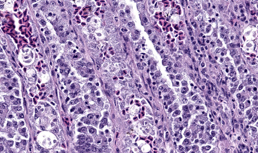 This case provided a nice example of granulopoiesis in the liver, characterized by granulocytes that lacked a bilobed nucleus and clustered with hematopoietic precursors. It is easy to overlook or over-interpret extramedullary hematopoiesis, but knowing which species it is normally and commonly seen in is important. Birds, reptiles, and some rodents can routinely have foci of EMH in their livers. There was additionally some beautiful tertiary lymphoid follicle development in this case secondary to the chronic inflammation!