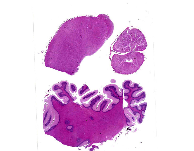 1. Brain, cerebellum and brainstem: Meningoencephalitis, lymphocytic, multifocal, mild to moderate, with multiple brainstem neutrophilic microabscesses.